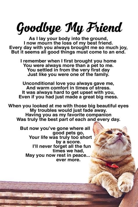 Goodbye To A Cat Quotes & Sayings. Showing search results for "Goodbye To A Cat" sorted by relevance. 500 matching entries found. QUOTES. Goodbye, Elizabeth. Goodbye, my love, my friend, my pain, my joy. Goodbye.Apr 18, 2022 · Best Loss of a Cat Quotes. “What we have once enjoyed and deeply loved we can never lose, for all that we love deeply becomes a part of us.”. – Helen Keller. “Many …Saying Goodbye To A Pet Cat Quotes & Sayings. Enjoy reading and share 8 famous quotes about Saying Goodbye To A Pet Catwith everyone. Top Saying Goodbye To A Pet Cat Quotes. So for …Jun 13, 2022 · Pet Memorial Sayings for Cat to Inscribe on Urn & Headstone "When the cat you love becomes a memory, the memory becomes a treasure." "There’s a soft and warm place …"No heaven will not ever Heaven be. Unless my cats are there to welcome me." - Anonymous "Death ends a life, not a relationship." - Jack Lemmon "I know for certain that we never lose …Jul 22, 2022 · The cat is so in love with her. So sorry for your loss," and @ fdipas85 said, "I’m so sorry for you. I'm so happy your baby had such a good, dedicated friend to comfort them." Us …Dec 15, 2021 · “Never say goodbye because goodbye means going away and going away means forgetting.” – J.M. Barrie (Peter Pan) “It’s time to say goodbye, but I think goodbyes are sad and …